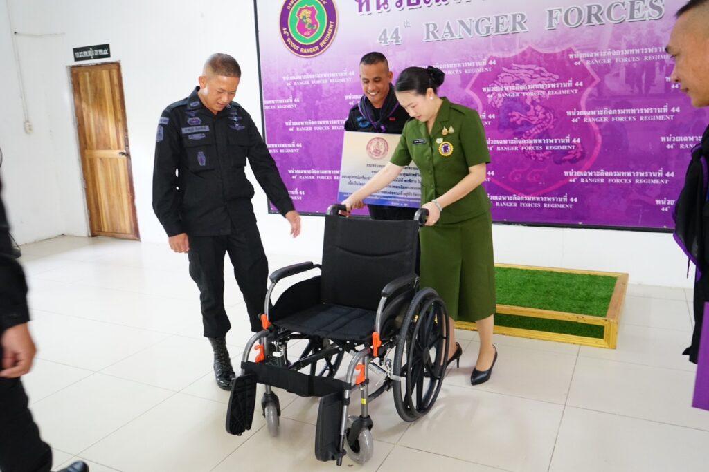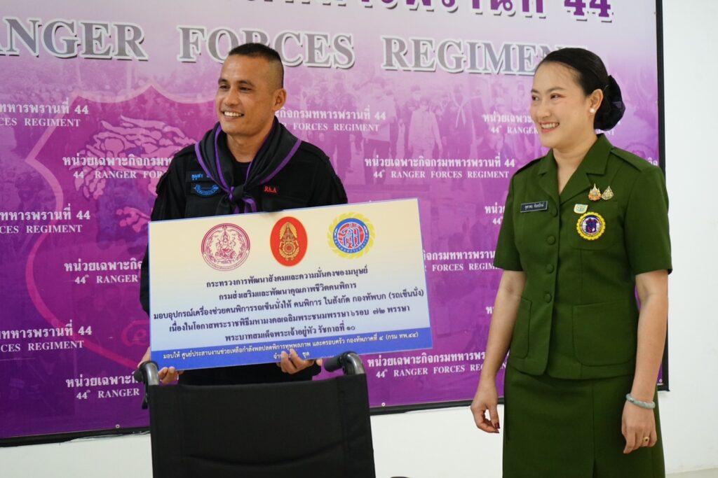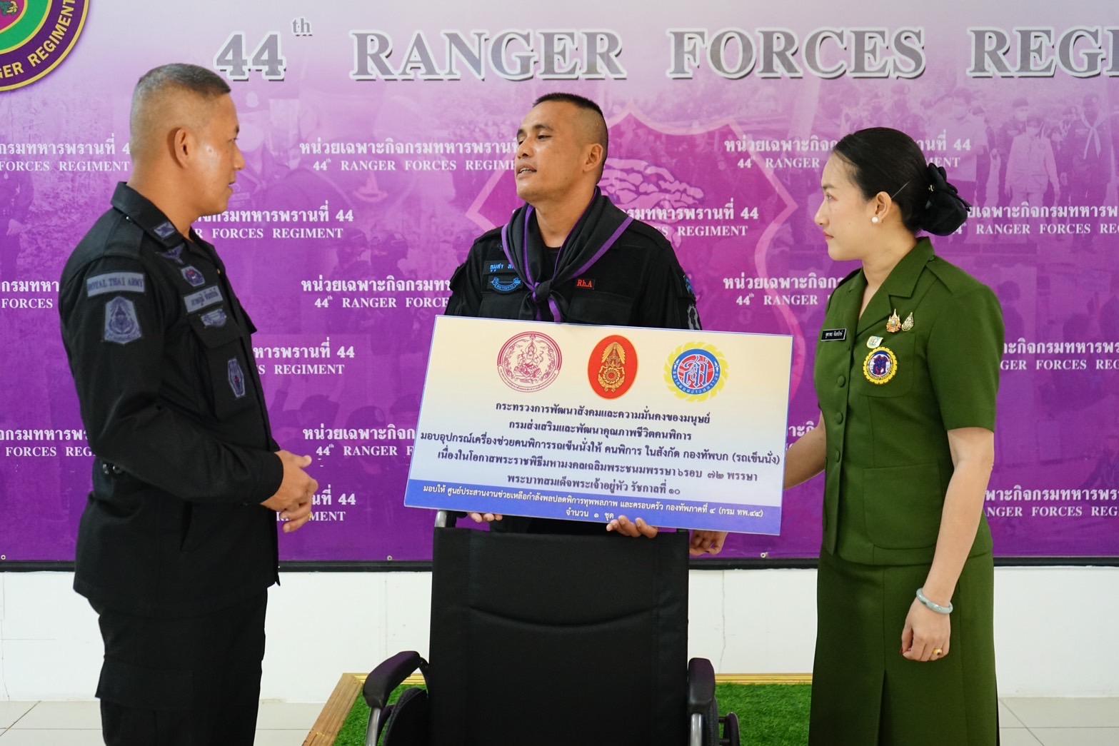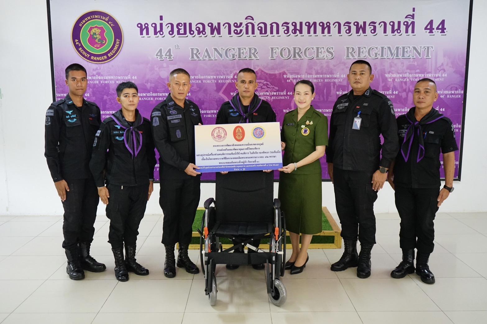 ขณะที่เมื่อช่วงเช้าของวันนี้เวลาประมาณ 08.30 น. ที่ ห้อง บก.กรม ทพ.44 ต.ปะเสยะวอ อ.สายบุรี จ.ปัตตานี พ.อ.ภาคภูมิ จันทรักษ์ ผบ.กรม ทพ.44/ผบ.ฉก.ทพ.44 พร้อมด้วย คุณ จุฑาพร จันทรักษ์ ประธานสมาคมแม่บ้าน ทบ.สาขา กรม ทพ.44 ได้ดำเนินการมอบอุปกรณ์สำหรับช่วยเหลือคนพิการประเภทรถเข็นนั่ง จำนวน 1 คัน มอบให้แก่ นาง มุน๊ะ หนูชูสุข ซึ่งเป็นมารดาของกำลังพล อส.ทพ.กูมูสา สตอนหลง ในโครงการมอบกายอุปกรณ์สำหรับช่วยเหลือคนพิการ จำนวน 72,000 ชุด