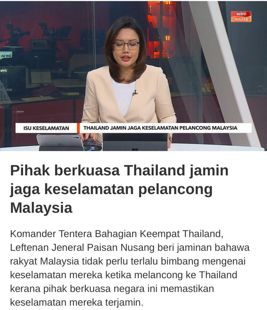 สถานีโทรทัศน์ชื่อดังของมาเลเซีย ช่อง Astro Awani ได้เผยแผร่สารคดีเชิงข่าว เรื่องความปลอดภัยของนักท่องเที่ยวชาวต่างชาติ ที่เดินทางเข้ามาท่องเที่ยวในประเทศไทย ยังเน้นย้ำอีกว่า